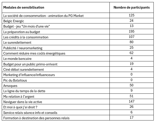Du mois de janvier 2025 au mois de décembre 2025, nous avons organisé et animé 117 ateliers interactifs abordant diverses thématiques en vue de préparer le public à une vie économique saine. Cela représente plus de 2114 heures d’animation. 941 (dont 604 nouveaux participants) personnes ont participé à ces modules de sensibilisation ainsi que 130 professionnels les accompagnant. 42 structures ont fait appel à nos services pour l’organisation d’un ou plusieurs modules de sensibilisation.